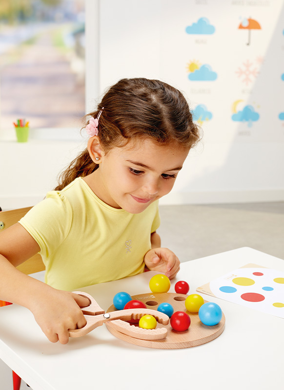 Mit der großen Holzschere werden die bunten Bälle auf dem Spielbrett in eine bestimmte Position gebracht, wie auf den Arbeitskarten vorgeschlagen. Die Kugeln unterscheiden sich durch ihre Farbe und ihren Durchmesser. Die 6 doppelseitigen Karten bieten 12 Aktivitäten, die in zwei Schwierigkeitsgraden organisiert sind.