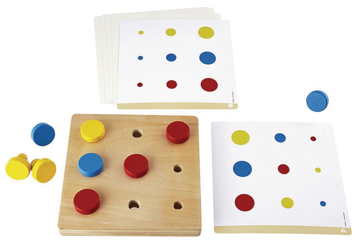 Dieses Spiel spricht mehrere Kompetenzen an: Erkennen von Farben und Größen, Üben der Feinmotorik und der Hand-Augen-Koordination, Verbesserung der räumlichen Wahrnehmung, Analyse und Interpretation einer Aufgabe.