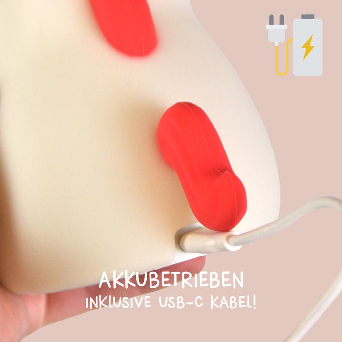 Das Nachtlicht ist akkubetrieben und kann über das mitgelieferte USB-Kabel ganz einfach aufgeladen werden. Eine volle Ladung dauert ca. 4.5 h. Danach kann Maggy Magic im gedimmten Zustand bis zu 200h und im hellsten Zustand bis zu 5h leuchten.