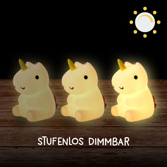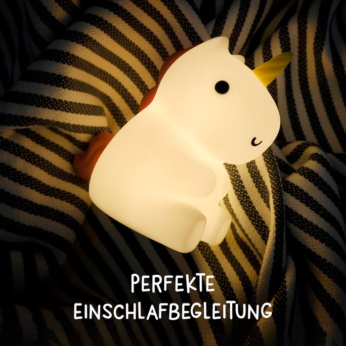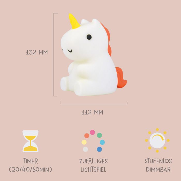 Dieses Nachtlicht ist nicht nur eine Einhorn Lampe, sondern wird durch das sympathische Design zu einem treuen Begleiter für das Kind. Maggy vermittelt Sicherheit und Geborgenheit. Das erleichtert das Einschlafen, vertreibt böse Nachtmonster und ist auch auf Reisen sehr praktisch. Das Nachtlicht verfügt über eine angenehm warmweiße Lichtfarbe, die besonders schlaffreundlich für die Augen wirkt und so das Einschlafen erleichtert. Für das Aktivieren dieser Funktion muss der Timer-Knopf in schneller Abfolge zweimal hintereinander betätigt werden. Zum Ein- oder Ausschalten des einfach das Schwänzchen drücken. Durch längeres Drücken kann das Licht gedimmt werden. So wird es zum optimalen Begleiter zum Stillen, Einschlafen, Vorlesen und auch während des Schlafens.