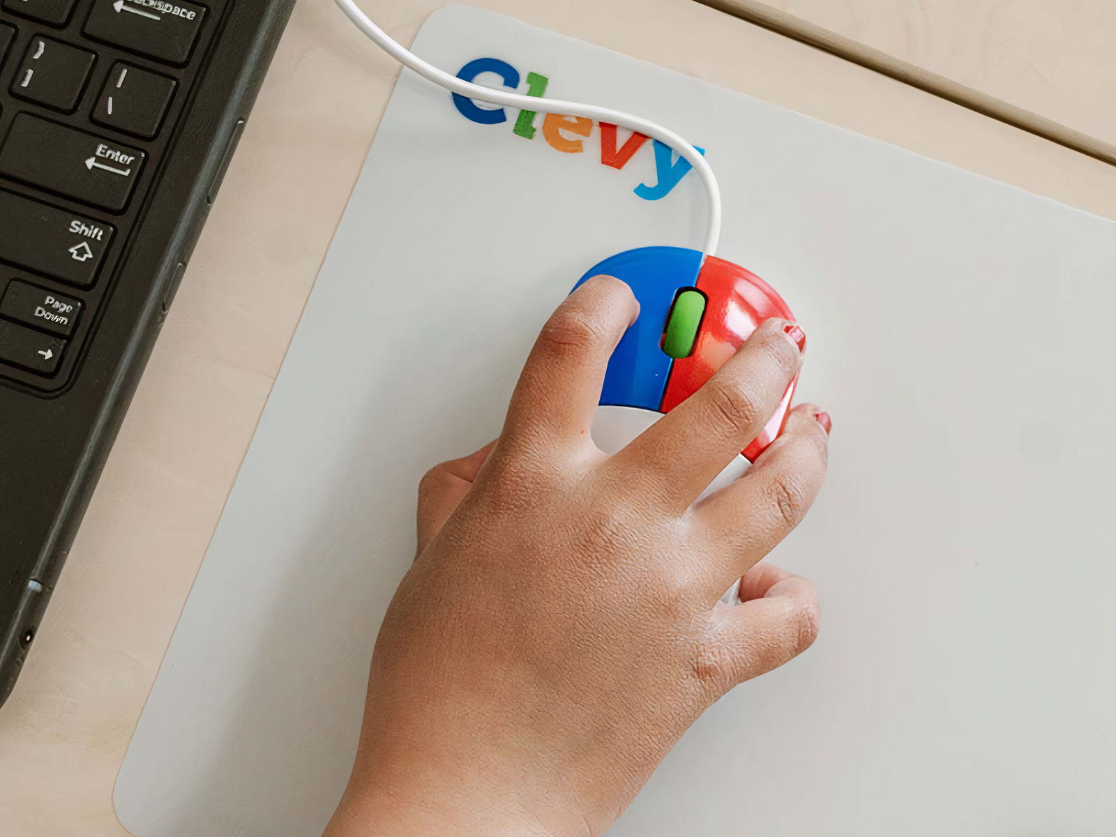 Die beiden Maustasten der Clevy Kinder Maus sind durch kontrastierende Farben deutlich unterscheidbar. So können Kinder leicht erkennen, welche Maustaste welche ist: Die rechte Maustaste ist rot, die linke Taste ist blau und das Scrollrad ist grün. Das farbenfrohe Design sorgt dafür, dass der Umgang mit der Computermaus weniger einschüchternd ist und den Schülern sogar Spass macht!