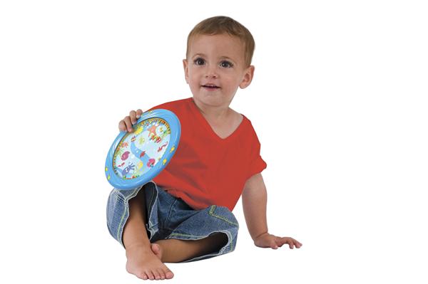 Leicht kippen und lauschen, wie die bunten Kügelchen sich in der flachen Meerestrommel mit einem Rauschen über die lustigen Fischapplikationen hinweg bewegen, das macht Spaß. Auch als Rassel lässt sich die Meerestrommel wunderbar einsetzen.