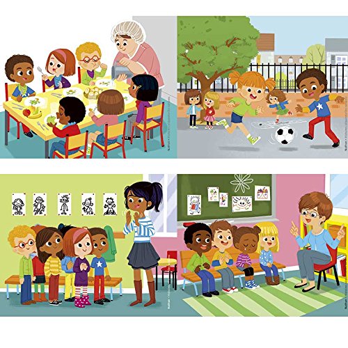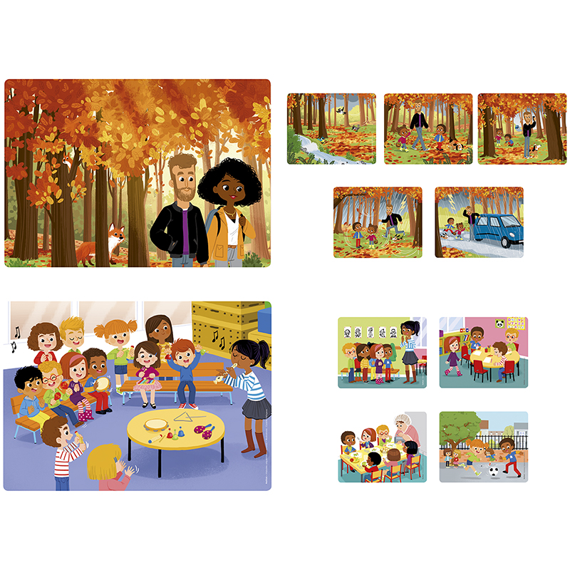 Die Kinder erforschen 2 Themen, die mit Zeitvorstellungen verbunden sind: den Tag eines Schulkindes und die Jahreszeiten. Jedes Thema wird in 4 Szenenbrettern und 4 sequentiellen Folgen (aus 4 oder 5 Bildern) mit den dazugehörigen Stimmungen und akustischen Hinweisen dargestellt.