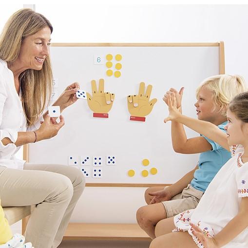 Die in dem Set enthaltenen magnetischen Hände mit umklappbaren Fingern ermöglichen eine Vielzahl verschiedener Spiele und Aktivitäten rund um die Zahlenwelt. Die Lernspiele können optimal auf das Alter und die Lernbedürfnisse der Kinder zugeschnitten werden.