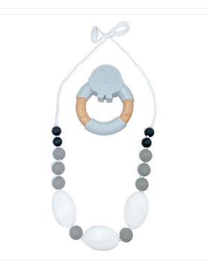 Dieses hübsche und elegante Set enthält eine schicke graue Halskette mit großen Silikon-Beißperlen sowie einen niedlichen Beißring aus Holz mit einer taktilen Silikoneule auf der einen Seite und einem gerippten Silikongriff auf der anderen. Kleinkindern hilft dieses Set beim Zahnen, größere werden beide Elemente selbst als Kau-Imput nutzen. Die Halskette ist für die Bezugspersonen gedacht, sodass sich das am Körper getragene Baby direkt damit beschäftigen kann. Die hochwertigen Materialien und das clevere Design überzeugen in allen Altersstufen. Sicher und leicht zu reinigen, hergestellt aus ungiftigen Materialien.