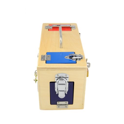 Diese große Montessori Holzbox steckt voller Geheimnisse! Da gibt es Riegel, Haken, Verriegelungen, Sicherheitsketten oder Hebel... und alle lassen sich unterschiedlich öffnen und wieder verschließen! Denn hinter jedem Schloß gibt es eine Tür, damit das Öffnen und Schließen so realistisch wie möglich erlebt werden kann. Die Box und die Türen sind aus Holz, die Öffnungen sind bemalt. Der Farbkontrast hebt das Öffnungssystem hervor.