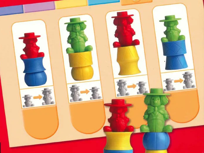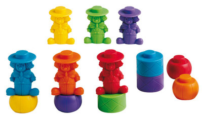 24 Clowns in 2 Größen (H: 4,4 cm & 5,5 cm) und 2 Farben (rot & grün), 48 Stapelsteine in 4 Formen (H: 22 cm) und 2 Farben (gelb und blau), 48 Aktivitätskarten, unterteilt in 5 Serien mit je 6 Karten und 1 Serie mit 18 Karten, 8 Antwortkarten , pädagogische Handreichung