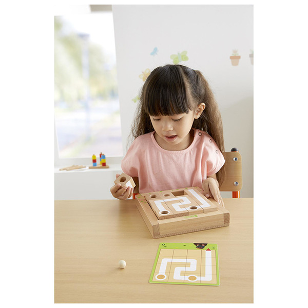 Der kleine Maulwurf hat sich im Labyrinth verirrt! Doch wer kann ihm heraushelfen? Bei diesem neuartigen und sehr hochwertigen Spiel geht es darum, ein eignes Labyrinth zu bauen und mit der kleinen Kugel sofort zu testen. 12 verschiedene Labyrinthe können mit den Holzwürfeln nach Anleitung konstruiert werden – liegen die Würfel richtig, kann die Kugel durchrollen. So werden Motorik, Raumorientierung und Logik geschult. Die Kinder erlernen das Erkennen von Hinweisen und entwickeln eigene Lösungsfähigkeiten.