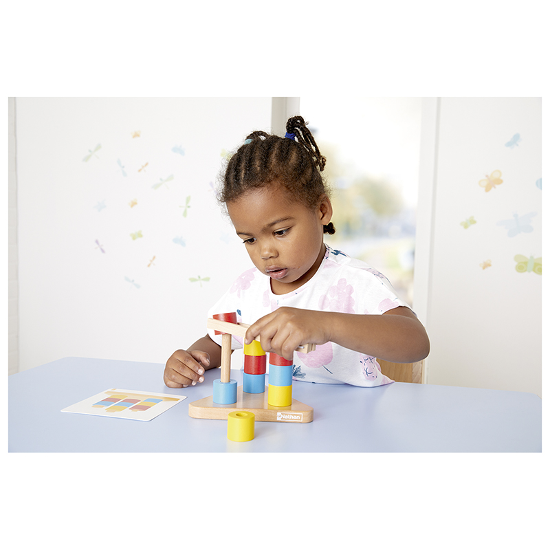 Dieses Spiel ist ein sehr guter Einstieg in die Feinmotorik und das selbstständige Lernen. Die Aufgabe besteht darin, 9 Zylinder in 3 Farben und 3 verschiedenen Innendurchmessern (klein, mittel, groß) mit Hilfe einer Pinzette zunächst beliebig und dann nach einem Muster auf Stangen zu stapeln. Das Set enthält 6 doppelseitige Aktivitätskarten: 12 Muster mit zwei Schwierigkeitsgraden zum Üben. Die erste Seite der Karte dient auch als Korrektur für die andere Seite.
